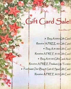 * Buy our popular "Buy 5/Get 6" Spa Package (applies to any facial or massage; purchase 5 and get a free one) and receive a $25 gift card free!