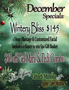 "Wintery Bliss" - $145 1 Hour Massage and Customized Facial. Purchase of this package automatically enters you in the client raffle for a chance to win the Wintery Bliss Gift Basket. $10 off a gel Mani/Pedi Combo